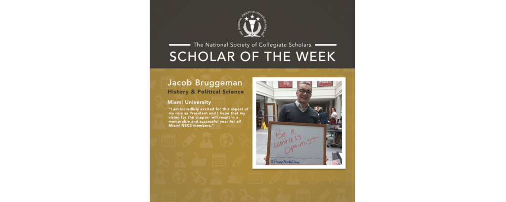 Meet our NSCS Scholar of the Week, Jacob Bruggeman! Jacob is a sophomore at Miami University where he is studying History and Political Science. Jacob was also recently elected Chapter President of the Miami University chapter of NSCS. Jacob's favorite NSCS...