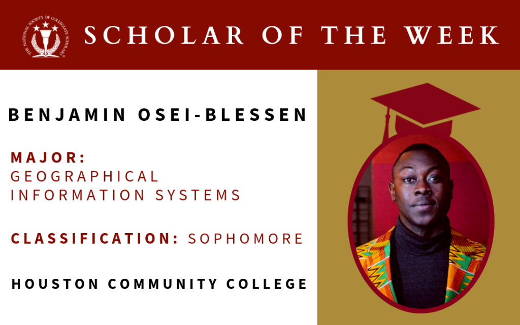 Meet our NSCS Scholar of the Week, Benjamin! Benjamin is a sophomore at Houston Community College where he majors in Geographical Information Systems. As a member of NSCS, Benjamin values community service. “There is nothing I enjoy more than giving back to the...